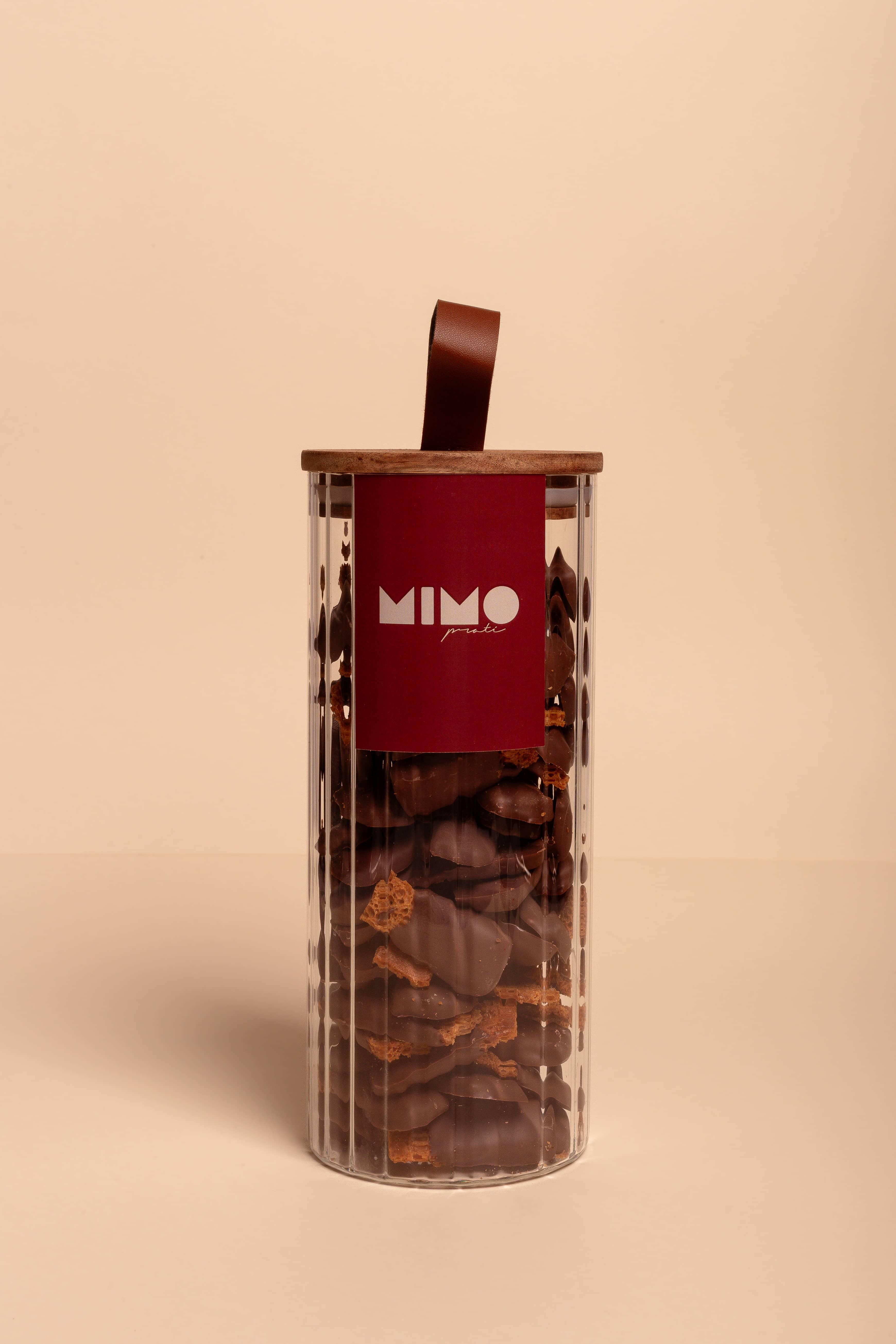 Crocante artesanal a base de mel e canela envolto de chocolate branco e uma pitada de canela.